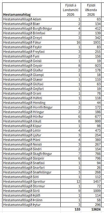 Fjöldi keppenda fyrir hvert félag á Landsmót