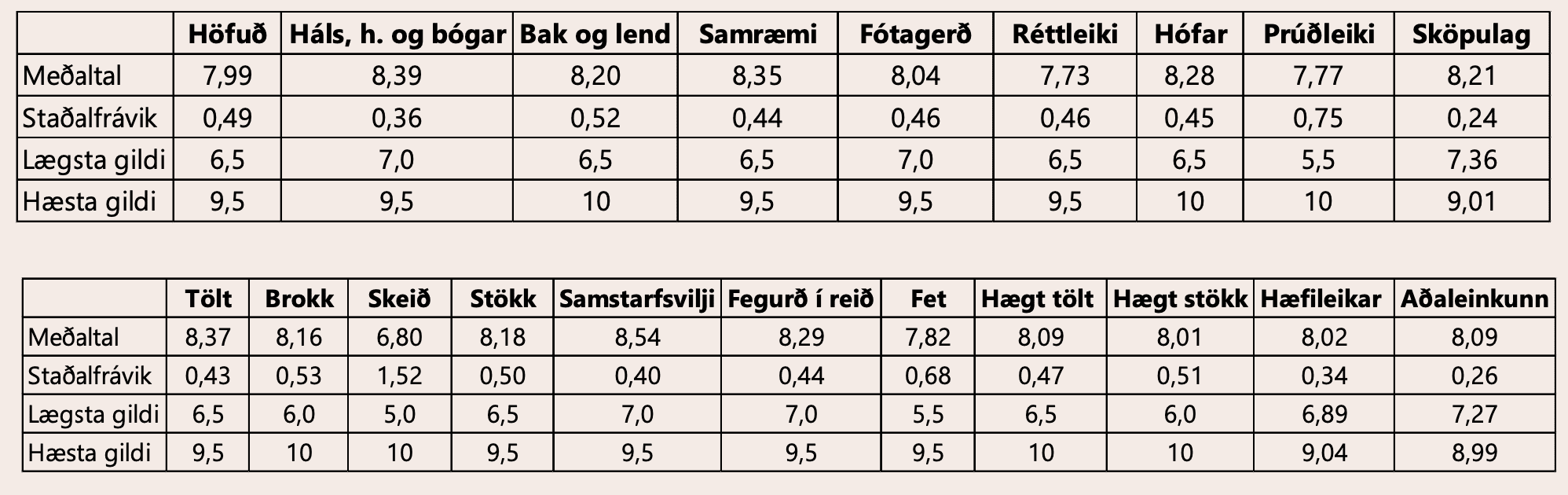 Í töflunum hér fyrir neðan má sjá meðaltöl og breytileika í einkunnagjöf allra eiginleika í sköpulagi og hæfileikum á Íslandi á árinu: