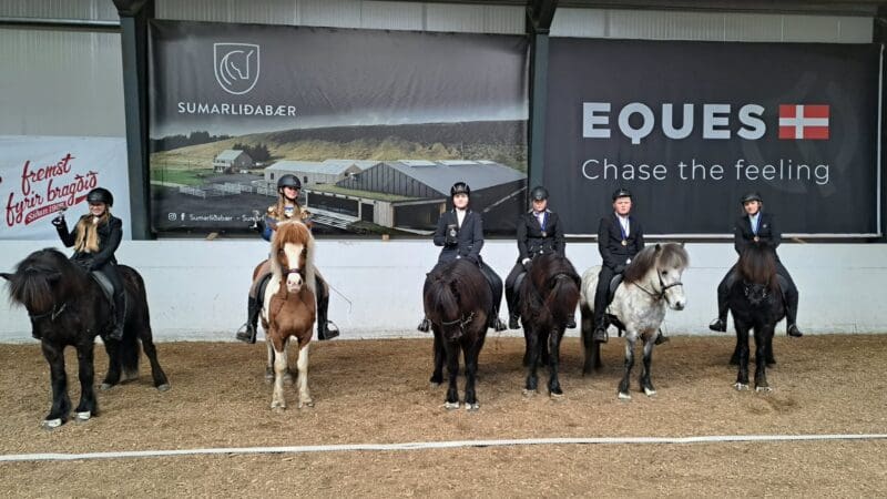 Fjórgangur Unglinga F.v. 1. sæti Anna Sigríður Erlendsdóttir (Geysir), 2. sæti Talía Häsler (Ljúfur), 3. sæti Ólavía Ósk Gunnarsdóttir (Sleipnir), 4. sæti Karólína Ævarr Skúladóttir (Sleipnir), 5. sæti Helgi Björn Guðjónsson (Geysir) og 6. sæti Júlía Mjöll Högnadóttir (Sleipnir).