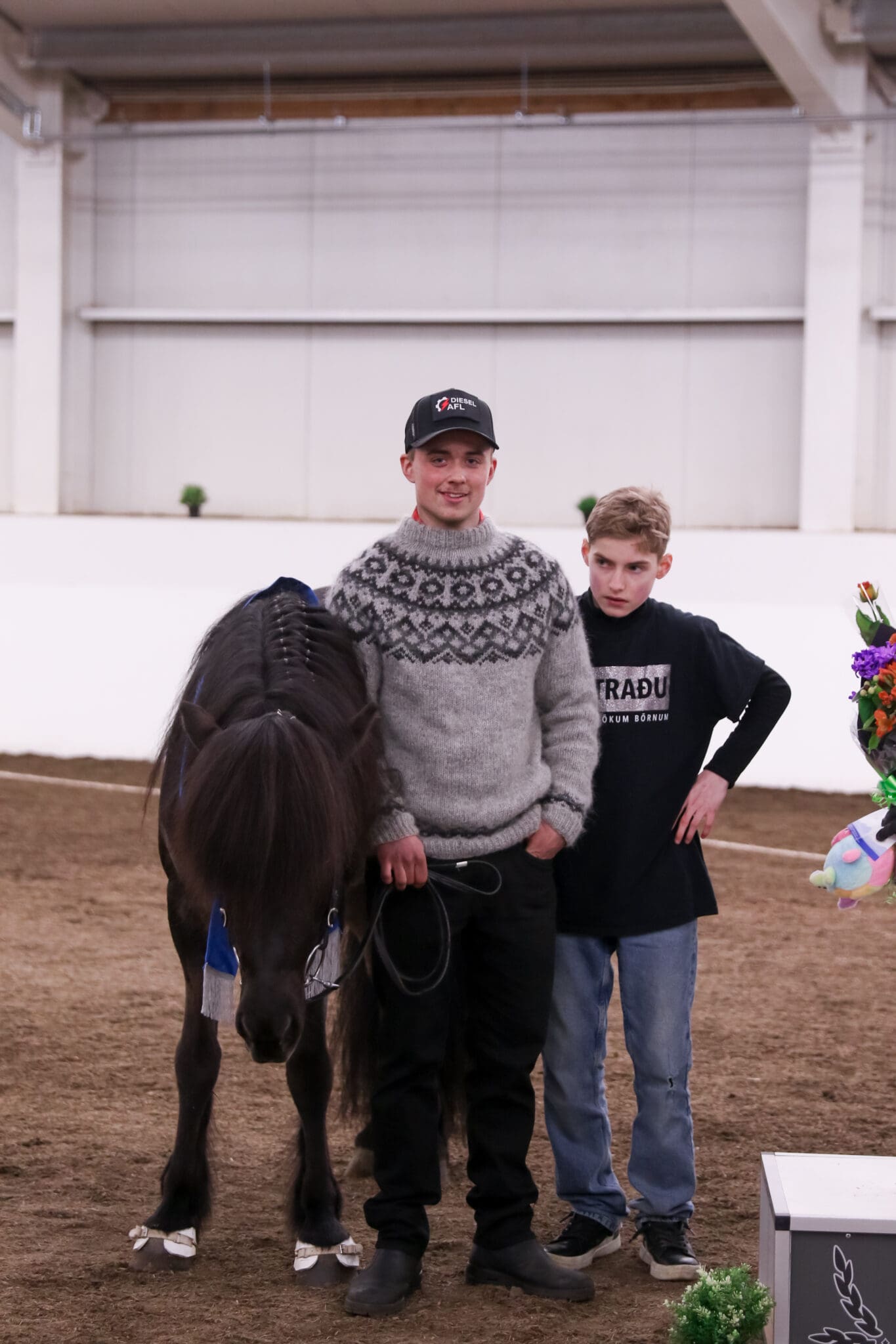 Þeir Trausti Ingólfsson fyrir hönd Diesel afl, sem bauð frítt inn í kvöld, og Þórður Bragi Sigurðsson. Sáu um að veita verðlaun kvöldsins. Með þeim er gæðingurinn Tónn frá Hjarðartúni. Ljósmynd: Freydís Bergsdóttir