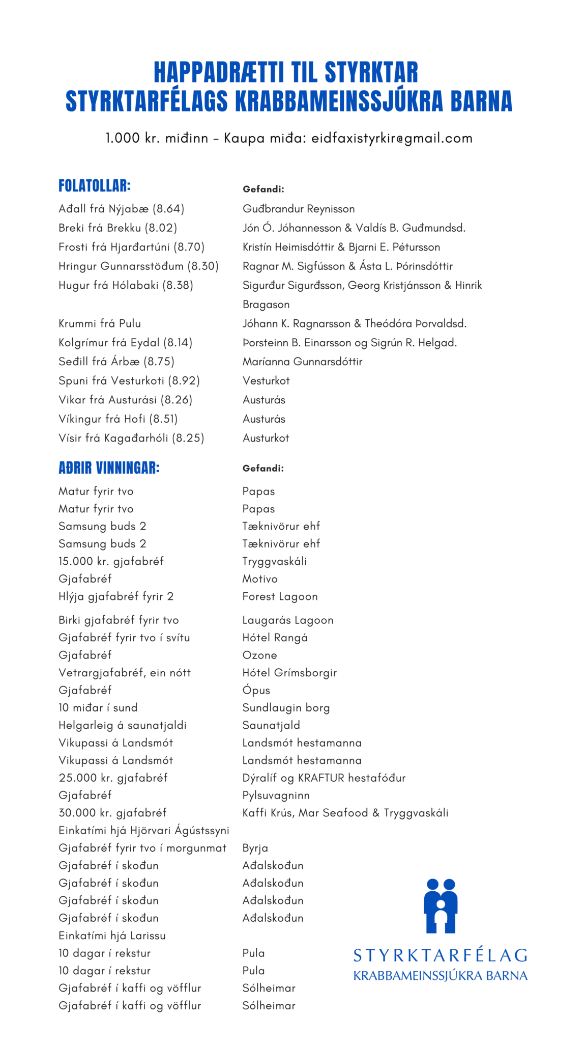 Margir flottir vinningar eru komnir á listann t.d. folatollar, út að borða, hótelgisting, vikupassi á Landsmót o.fl. Hægt er að sjá vinningana hér fyrir neðan: