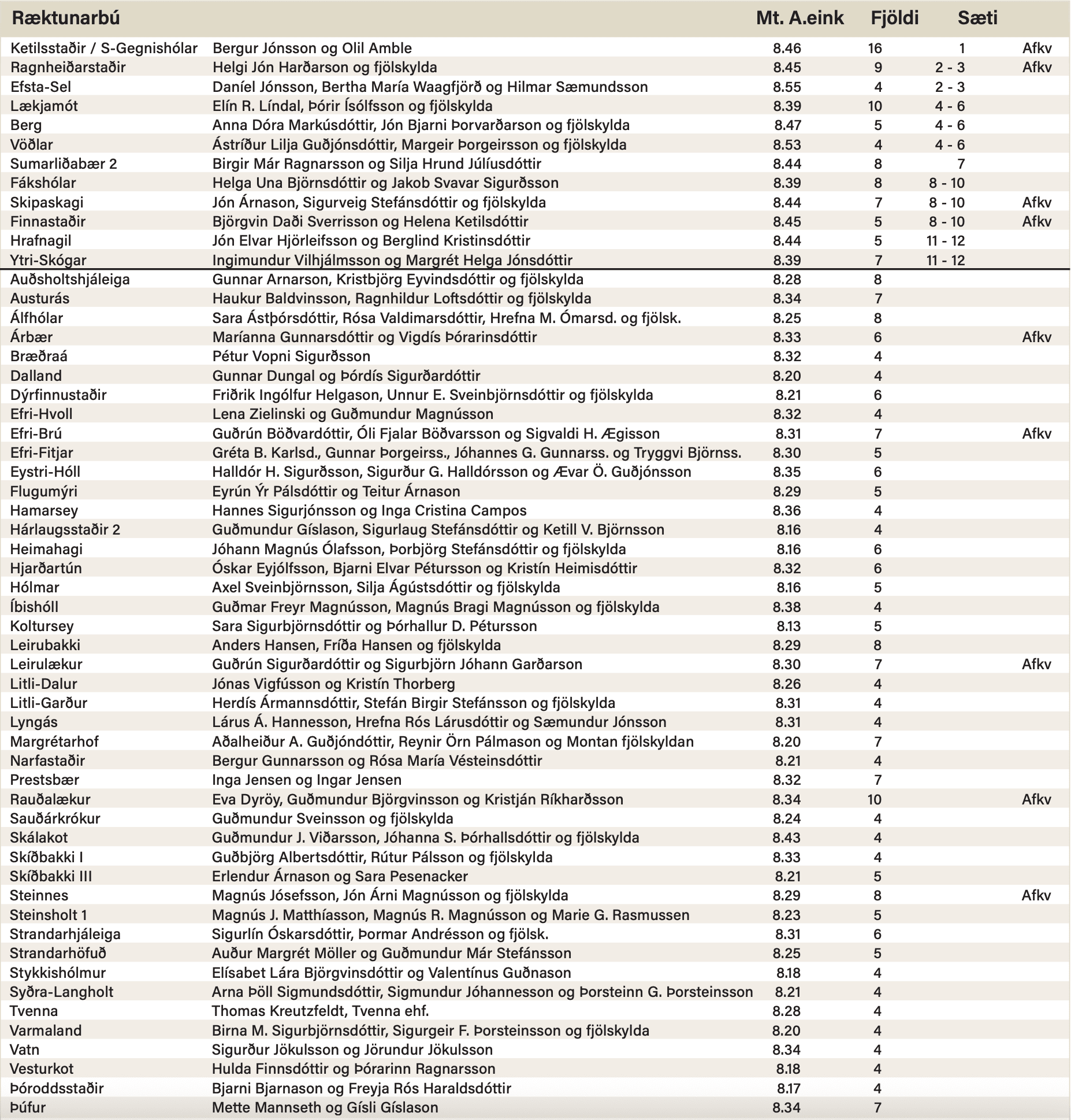 Í meðfylgjandi töflu eru öll búin, 56 að tölu, sem uppfylltu fyrrnefndar lágmarkskröfur árið 2025. Dálkarnir sýna meðaltal leiðréttrar aðaleinkunnar og fjölda sýndra hrossa sem ná 8,00 í aðaleinkunn eftir leiðréttingu (en afkvæmahross bæta við fjöldann). Þá er sérstaklega tilgreint í síðasta dálknum ef afkvæmahross leggja til stiga og auka á fjölda hrossa fyrir búið á árinu. Efst í töflunni eru þau tólf bú sem tilnefnd voru til viðurkenningarinnar í ár í þeim sætum sem útreiknuð stig raðaði þeim í en þar fyrir neðan eru búin sem komu auk þeirra til greina í ár í stafrófsröð.