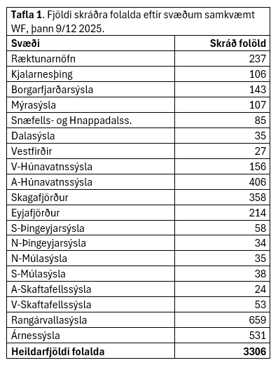 Þegar þetta er ritað er búið að grunnskrá 3.306 folöld, af þeim hafa 2.379 skráð örmerki. Samkvæmt skráningum í WF hefur fjöldi fæddra folalda síðustu ár verið rétt innan við 6.000, þannig enn er slatti af folöldum óskráð. Í töflu 1 er hægt að sjá fjölda skráðra folalda eftir svæðum.