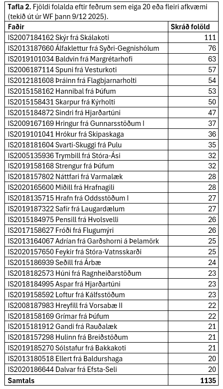 Þó aðeins sé búið að skrá rúmlega 50% fæddra folalda þá er gaman að skoða hvað feður eiga flest þessara folalda. Þegar niðurstöður voru teknar út úr WF Þann 9/12 2025 eiga 32 hestar 20 eða fleiri folöld, sjá nánar í töflu 2. Það þýðir eins og staðan er í dag að 34% skráðar folalda undan 32 feðrum.